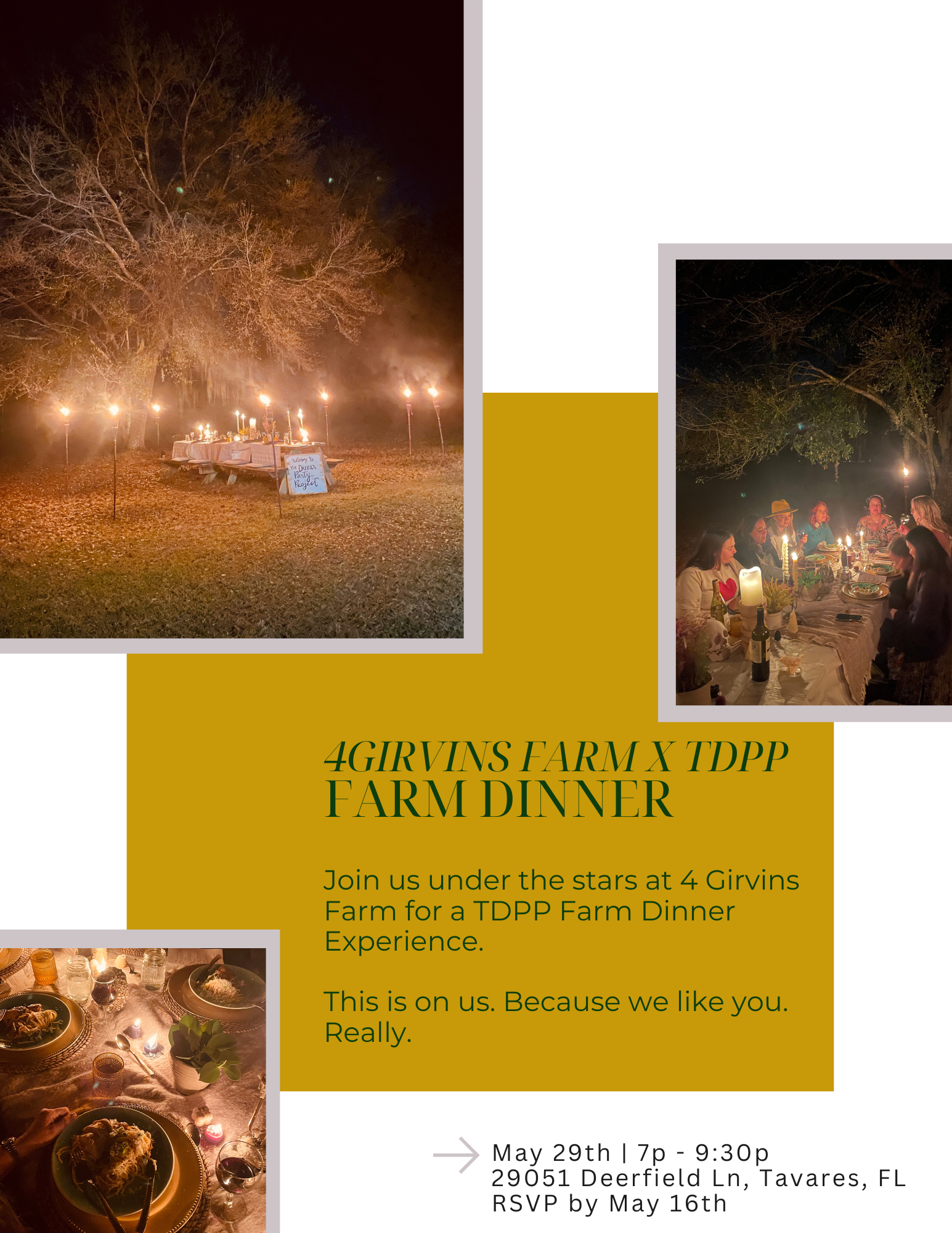 4Girvins Farm and TDPP are preparing the table for you. Come ready for a tour of the farm, to meet some new folks, be hungry for a multi-course dinner and lots of drinks with pair with.