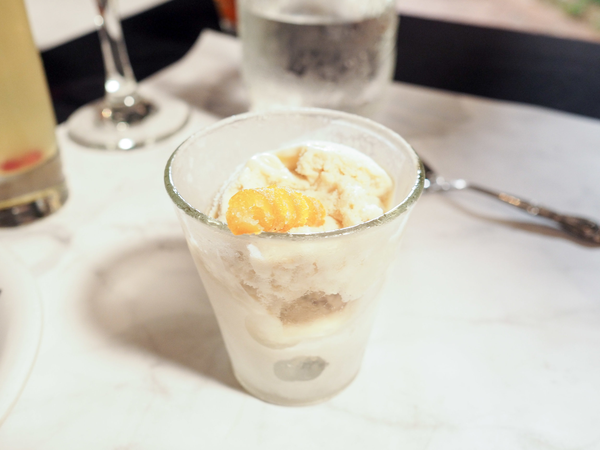 Finally, time for dessert! We were real spoiled that night as we were served not one, but TWO dessert courses, as well as a champagne dessert cocktail! This might be what dreams are made of. First, we enjoyed a Strawberry Basil Sorbet Aperitif - so refreshing and great for cleansing the palette. And to top it all, Woodford Reserve Homemade Cheesecake Ice Cream hit the table and all bets were off!